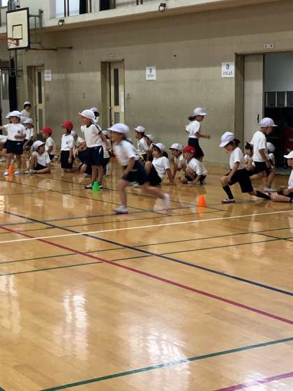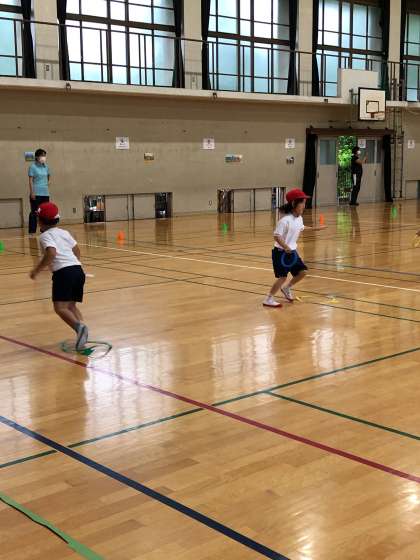 ゴールまでのミッションが多いほうが子どもたちは盛り上がるようで,グループの友達が走る様子を見ながら,自分の順番を今か今かと待っていました。気持ちがはやりすぎて,けんけん跳びを忘れてしまうこともありましたが,元気に楽しく活動することができました。