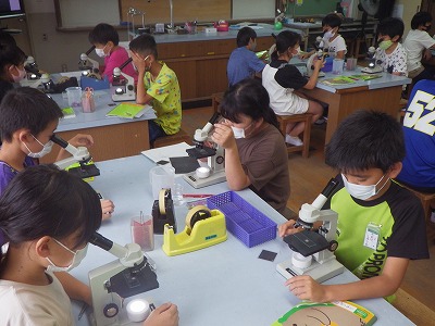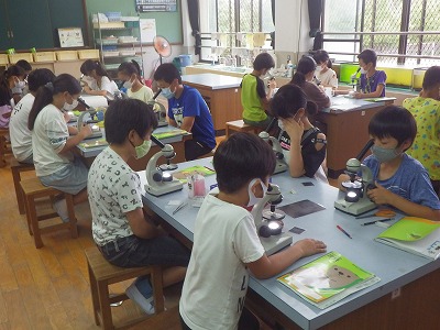 今日は顕微鏡を使ってアサガオの花粉を観察しました。藤城小学校には1人1台の顕微鏡がそろっているので,じっくりと観察することができます。顕微鏡の照明もすべてLEDに交換してあるのでとても明るく観察しやすくなっています。ピントが合った瞬間,「見えた!」,「トゲトゲがある。」,「ちょっと気持ち悪い。」などといろいろな声が聞こえてきました。