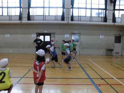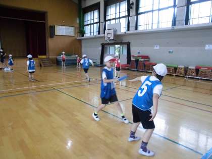 体育館でリレーの学習をしました。バトンパスをする時には,「はい!」と声をかけながら全力で走り切りました。チームワークも出てきて,毎回どのチームもいい勝負です。