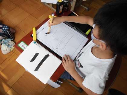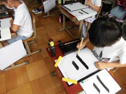 はじめての習字道具にドキドキ。準備や片付けの仕方をしっかり覚えてやる気満々です!力強く迫力ある字を書くことができました。