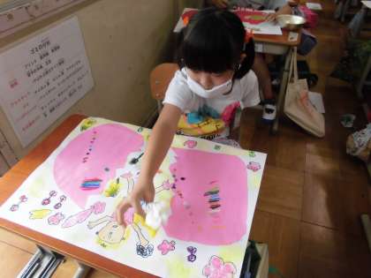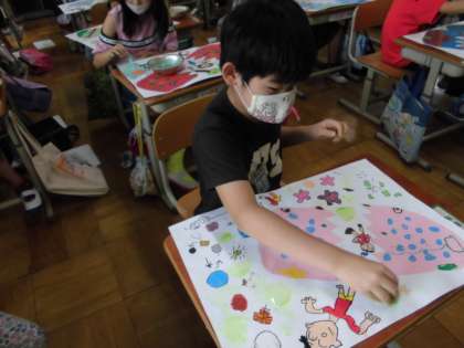 「ふしぎなたまご」の絵が完成しました。たまごが際立つような色の絵の具を選び,ティッシュでポンポンと背景に色をつけました。個人懇談会の時にぜひご覧になって下さい♪