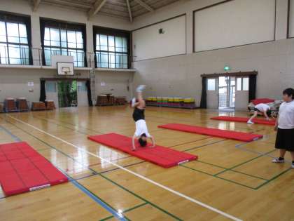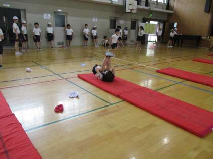 取り組んでいるうちに感覚を徐々に取り戻してきたようで前方倒立回転など高度な技もきれいに決める児童もいました。これから頑張っていきましょう。