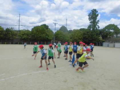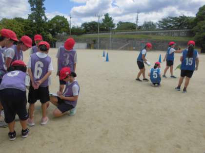 体育の学習でリレーに取り組んでいます。相手チームと競うのではなく,自分のチームのタイムをどうすればあげることができるのかをみんなで考えています。バトンパスやリードの仕方など工夫が多くみられています。