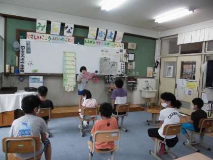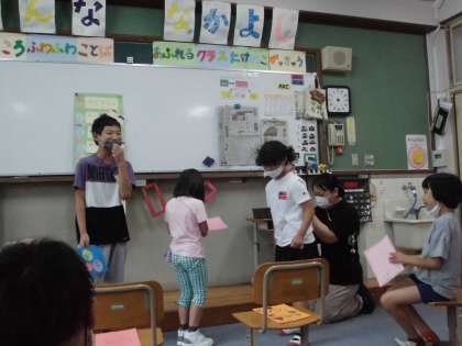 待ちに待った7月生まれのお友達のお誕生日会でした。お祝いされる方もする方もとっても嬉しそうで,素敵な会になりました(^^)司会進行や初めの言葉,プレゼント渡しをする様子です。