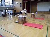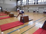 体育でとび箱に取り組んでいます。たかい段を飛び越えることができたときには「いけた!」「次の技やろう!」と喜び,意欲的に取り組んでいます!