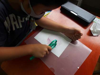 和紙に挟んで,はさみでこするととてもきれいな色ができました。