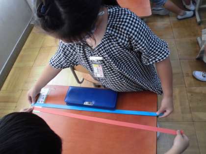 今日は,赤テープと青いテープの長さを求めたり,教科書やはがきのたてとよこの長さの比べ方を考えたりしました。