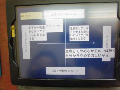 班の中で,よりよい学校生活のために何ができるかを考えました。考えたことから現状と問題点をだし,解決方法を計画に沿って話し合っていました。座標軸を使い,それぞれの意見を整理していました。
