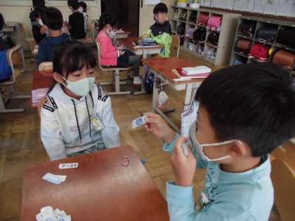 今日の算数科では,けいさんカードで遊びました。ペアの友達に出されたカードを見て答える「こたえはいくつ」と,ペアでカードを出し合って大きい答えのカードを出したほうが勝ち,という「おおきさくらべ」です。
