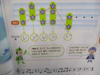 教科書に書いてある音を選んでつなげて,鍵盤ハーモニカで拭いてみると,あら,いい感じ♪