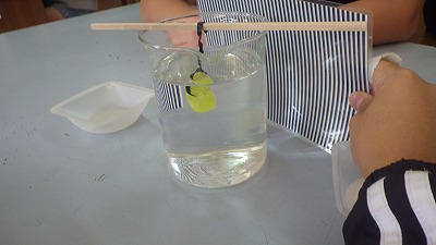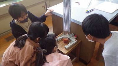 「もののとけ方」という学習が始まりました。今日はキャンディーアメや食塩の溶ける様子を観察しました。水を入れたビーカーにキャンディーアメをつるすと,すぐにもやもやしたものが出始めました。2時間目の学習が終わる頃には全部溶けてなくなってしまいました。食塩は水を入れた1mパイプに少しずつ落としていきました。落ちていく1粒の食塩を目で追っていくと,底に着くまでに消えてしまいました。溶けて見えなくなっていく様子にみんなびっくりしていました。