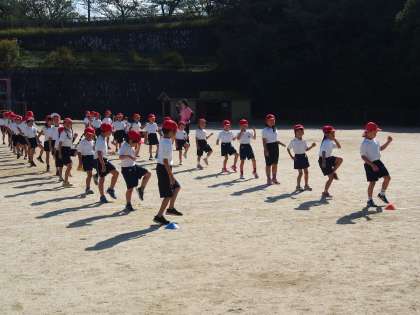 準備体操をして,体をほぐしてから競技開始です!みんなで練習してきたダンス『Oh!スージー』を楽しく踊りました。