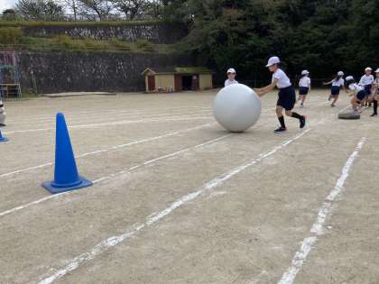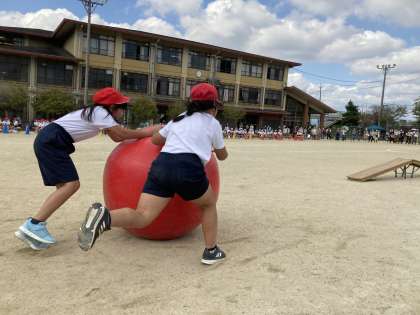 選択競技の大玉転がしでは,ペアを組んで大玉を転がしました!