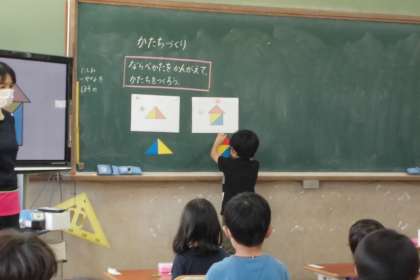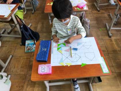 三角形を回したり,反対に向けたり,工夫しながらかたちをつくっていきました。