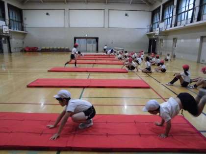 前転や後転に挑戦しています。体慣らしの動きも班のみんなで協力して進めることができてきました。