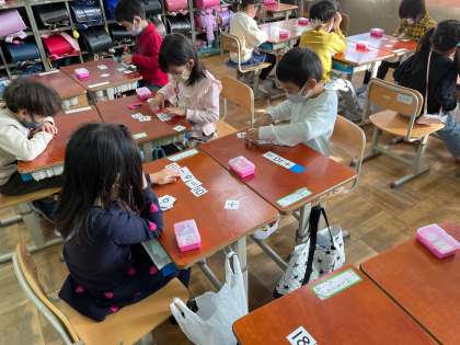 数字カード,+−=などを使って式を作り,その中の1枚を裏返し,そのカードに何が書いてあるかをあてるゲームです。
