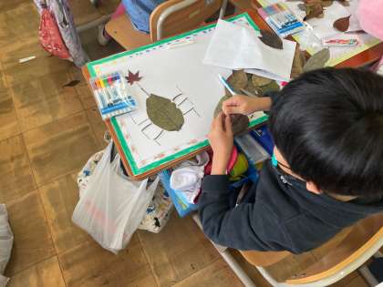 北堀公園や森林総合研究所で拾った葉やどんぐりなどを使って,作品作りをしました。