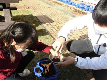 生活科の学習で,こまつなの種をまきました。種をまいた後には,上からそっと土の布団をかけて…大きく元気に育つように,水やりも頑張ります。