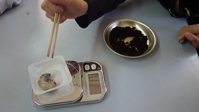 今日は青少年科学センターから頂いたカブトムシの幼虫を観察しました。大きな幼虫に育っているので,虫が苦手な子にはとっては少し刺激的な時間だったようです。割りばしを使って体重や太さを測りました。大きな幼虫は体重20g,太さ18mmほどに育っていました。もぞもぞした動きに歓声があがりました。