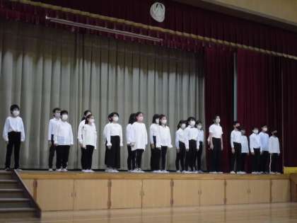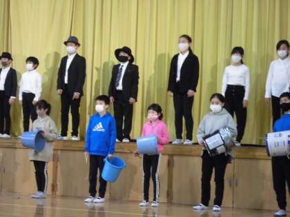 掃除道具を使っての演奏,みんなの息はぴったりで目が釘付けに…!そのあとの「I will follow him」では美しい歌声が体育館に響きました。さすがの高学年で,まさに「It's show time!」でした。