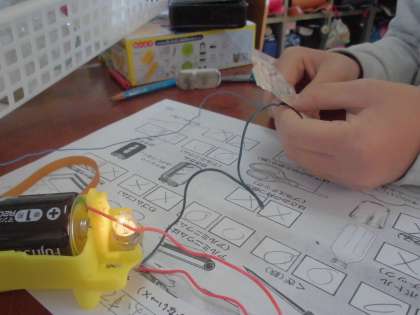 理科の学習では,どのようなものが電気を通すのかを豆電球を使って実験しました。