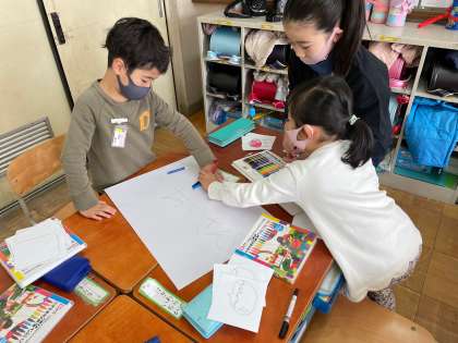 グループで話しをしながら,品物カードや看板づくりをがんばっていました。
