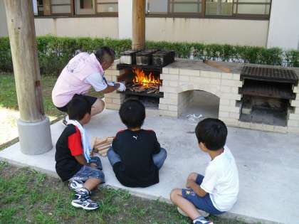 なかまどんランドで説明を聞いた後,子ども達は飯盒でごはんをたく係です。お米を洗って水加減をして,かまどの火ににかけて・・・・。おいしいごはんがたけるかな。