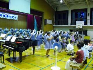 吹奏楽の夕べ,第2部は,懐かしい曲やテレビの主題歌などおなじみの曲がたくさん演奏されました。みんなのうたコーナーでは,子ども達も前に出てきて「マル・マル・モリ・モリ!」を楽しく踊りました。中1のみなさんの「YOSOKOIソーラン」の元気いっぱいの踊りもかっこよかったです。