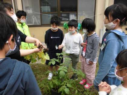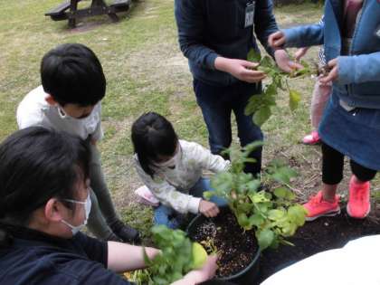 「やさいさーん,やさいさーん,だあれ?」の読みきかせのあと,藤城で育ったじゃがいもの収穫をしました。小さくても立派なおいもたちに大興奮の子どもたちは,夢中になって収穫していました。採れたおいもの数を数えたり観察をしたりと楽しく学習しました。