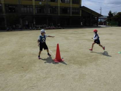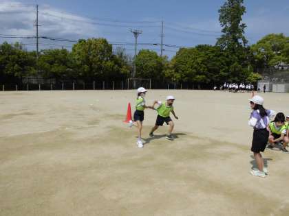 バトンを渡すのは難しいようで,落としてしまう子もいますが,練習をしてどんどん上達していって欲しいなと思います。