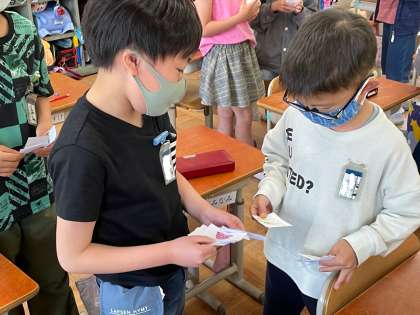 友達にあいさつをして名前を言い合い,カードを交換しました。