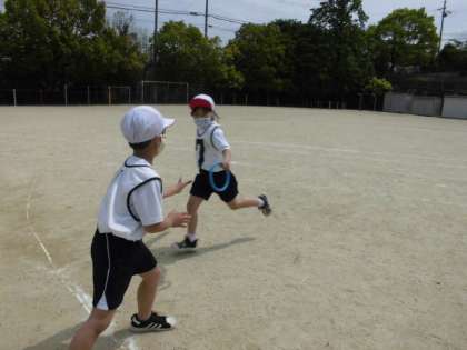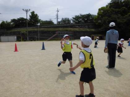折り返しリレーにチャレンジしています。「がんばれー!」と元気な声援のもと,友だちと協力して上手にバトンパスをすることができました。