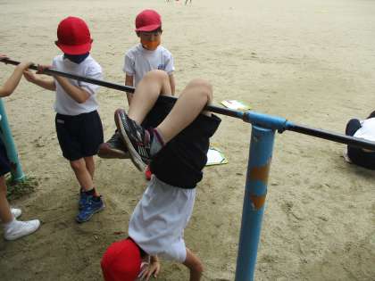 2年生になって初めて「てつぼう」の学習をしました。2人や3人でお互いに見せ合って練習をしました。前回りや逆上がり,こうもうや地球回りなどをしました。しっかりと順手でてつぼうを離さないようにすることを意識しました。これから少しずつできる技を増やしていきたいですね。
