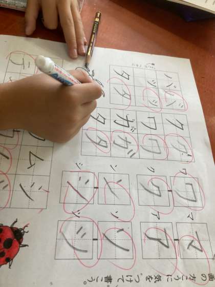 子どもたちの中には「先生,この姿勢つらいです。」という子もいました。でも,良い姿勢に慣れれば,自然と身につくはずです。良い姿勢で書けば,きれいな字を書こうという意識に変わります。宿題をやるときにも是非この姿勢でやってほしいと思います。