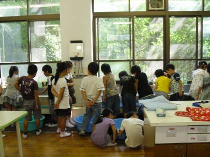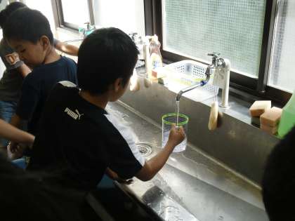 実際にやかん・なべなどの水のかさをはかり、比べ方や量り方を学習しています!