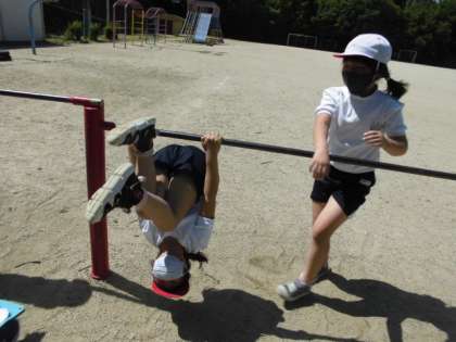 交流学習の体育で鉄棒に取り組んでいます。お友達とペアで技を見せ合いながら,できているところを褒めてあげたりアドバイスをしてあげたりと切磋琢磨してがんばっています!