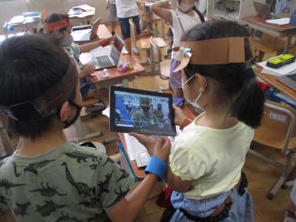 完成した衣装を着て,お互いにロイロノートを使って,写真や動画を取り合いました。是非,家でも変身して,おうちの方に見ていただきたいなと思います。