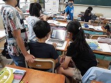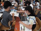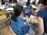 社会では,班の中で2つのグループに分かれ,沖縄と北海道それぞれの地域の特色についてタブレットでまとめ,発表の練習をしています。練習では,資料や絵を活用して分かりやすく相手に伝えようとしています!
