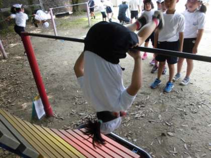 交流学習の体育で,鉄棒に取り組んでいた子どもたち。逆上がりや足かけまわりなどクラスの友だちと練習に励んだことで,自信がもてた様子。休み時間にも手にまめができるほどがんばっています。