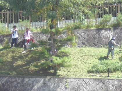 真夏を思わせるような太陽の下で,地域の方々がスロープ上の斜面の「すきです ふじしろ」をきれいに刈り込んでくださいました。くっきりと浮かんだ文字に見守られて1週間後,26回目の運動会が行われます。暑い中,本当にありがとうございました。