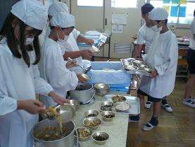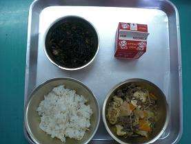 今日の給食献立は、肉どうふ、ひじき豆、牛乳、麦ごはんです。体を動かすことの多い一日、お腹もすいて・・しっかりといただきます!