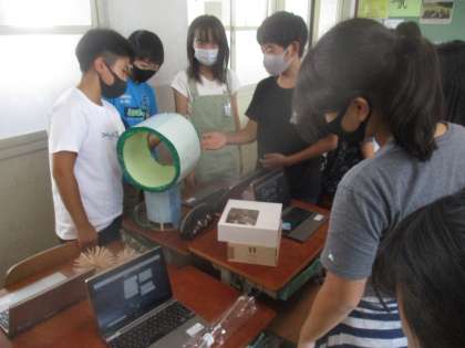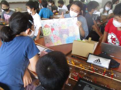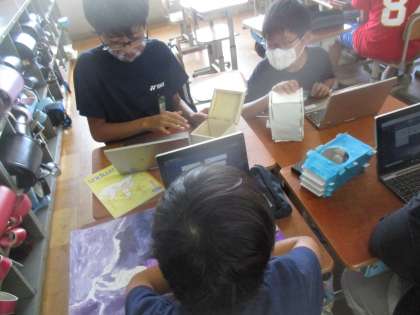 夏休みに作った作品を友達と交流していました。工夫したところや頑張ったところなどを発表し合いました。どれも素晴らしい作品でした。