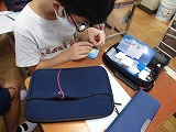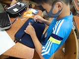 1学期に習った裁縫の学習を生かして,タブレットを持ち帰るためのケースに一つ一つ「フジシロ」と縫っていきました。初めての刺繍糸だったので,絡まったりすることもありましたが,丁寧に縫っていました!