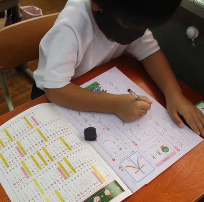 ひらがな,カタカナの学習につづき,漢字の学習が始まりました。一番初めの漢字は「木」。ゆっくり丁寧に書きました。