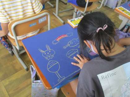 お話を聞いて、自分の好きな場面の絵を描きました。クレパスを使って、大きな紙に元気いっぱい描きました。
