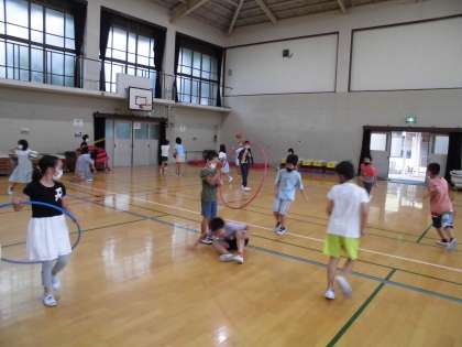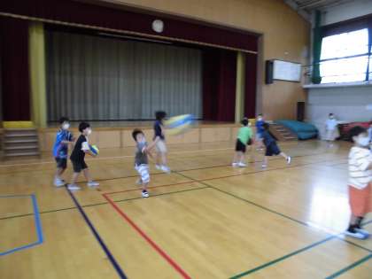 フラフープやボールなどを使って楽しく遊んで,汗びっしょりになっていました。