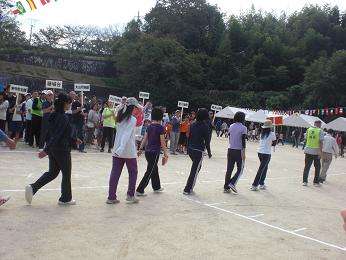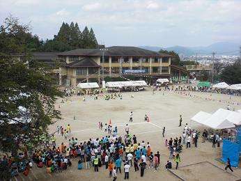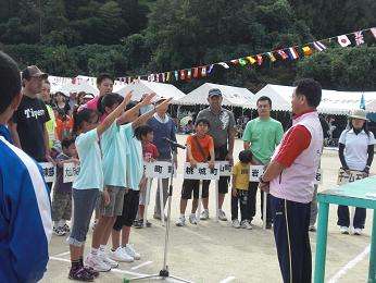 25日は朝から藤城学区民運動会が盛大に行われています。入場行進の最後に小学校教職員「チーム五郎太」が行進しました。昨年優勝チームの子どもたちが、元気よく選手宣誓をしたあと、熱気あふれる競技が始まりました。