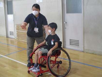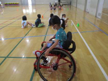 体育館で車いす体験をしました。車いすに乗ってまっすぐに進んだり,くるっと回転してみたり,後ろにさがってみたりしました。初めての体験にドキドキしながらも,真剣に取り組む姿が素敵でした。