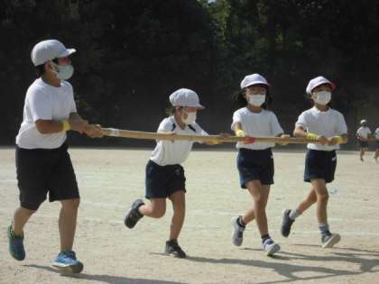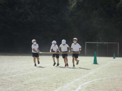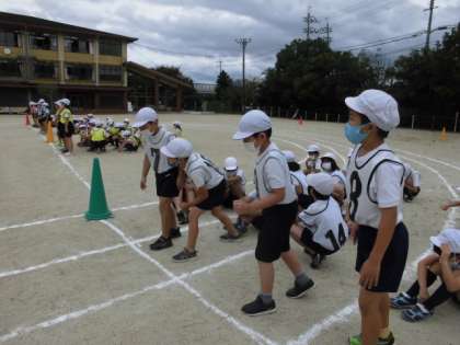3.4年生は,80メートル走やリレー,玉入れなどをがんばります。