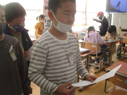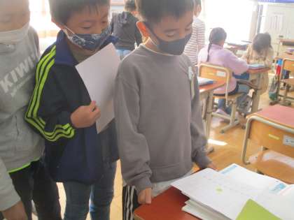 かけ算の学習が始まっています。子どもたちは,5のだんから順番に九九を覚えるのに一生懸命になっています。先週から九九チャレンジカードを使って九九テストを行っています。休み時間に先生のところに来て,九九を唱えています。一つのだんに上がり,下がり,バラの3種類があります。毎日コツコツテストを受けて,九九マスターを目指してほしいと思います。